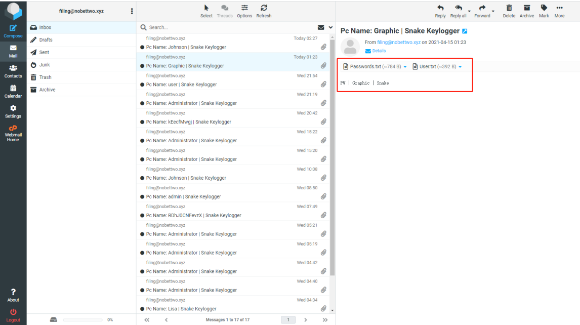 除了部分針對金融機(jī)構(gòu)人員的個(gè)人web郵箱賬號釣魚,攻擊者投遞載荷多為竊密類型木馬或僵尸網(wǎng)絡(luò)后門,如AgentTesla、Formbook、Ursnif、Lokibot、Trickbot等系列木馬。下圖展示的為AgentTesla竊密木馬的郵箱后臺,該木馬收集PC端瀏覽器記錄賬密等數(shù)據(jù)通過境外電子郵箱進(jìn)行回傳。