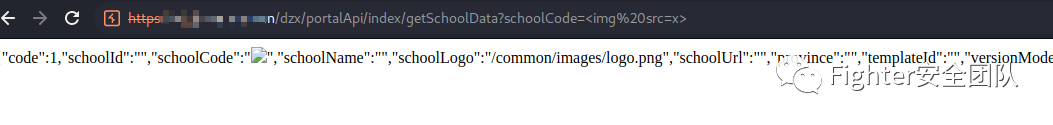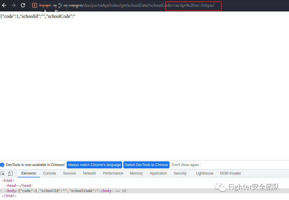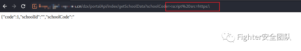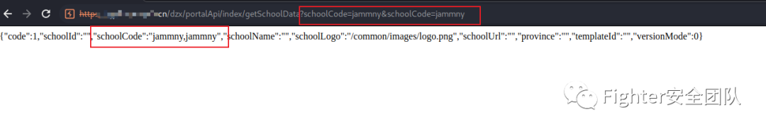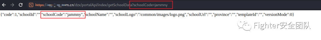 1、我發(fā)現(xiàn)目標(biāo)站點(diǎn)是存在傳參回顯的,我在參數(shù)schoolCode中傳入了一個(gè)值,接著返回的頁面中回顯了這個(gè)值。