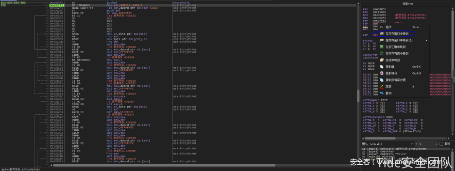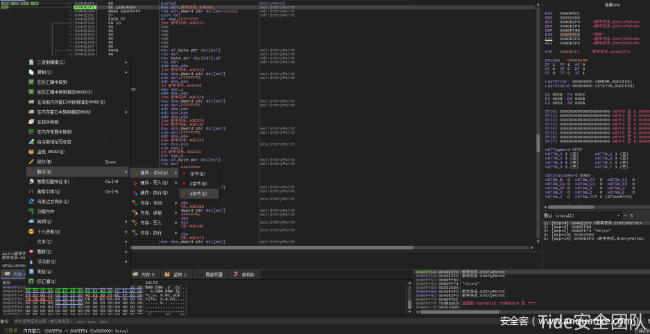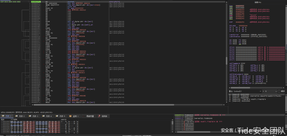 就是因為UPX是一個典型的pushad/popad結(jié)構(gòu),又要遵守堆棧平衡,即pushad之前的ESP需要跟popad之后的ESP相同,所以當我們看到UPX殼進入pushad后,對堆棧添加訪問斷點,當殼即將及執(zhí)行結(jié)束即執(zhí)行到popad要去還原堆棧時,必然會觸發(fā)斷點暫停下來,然后單步調(diào)試往下走,原始OEP就在附近了。