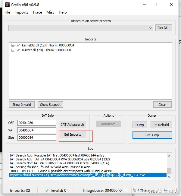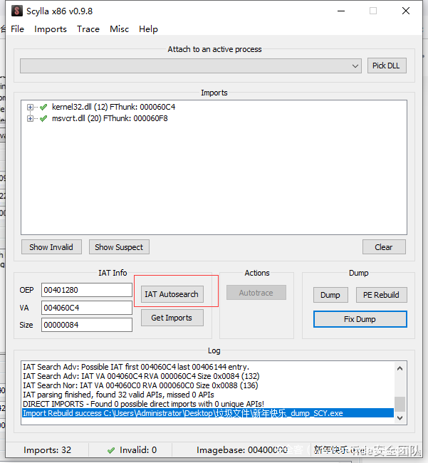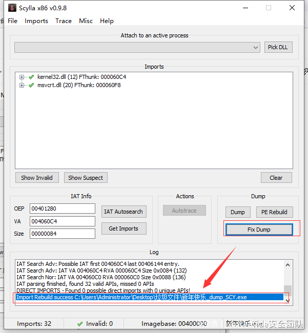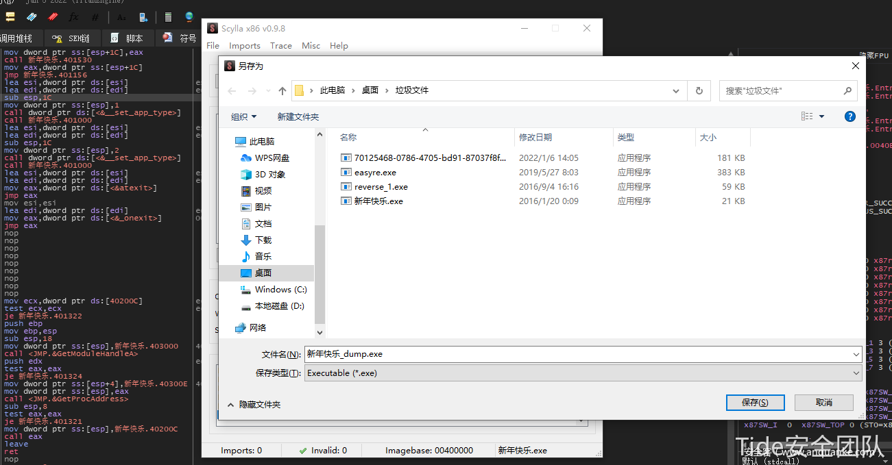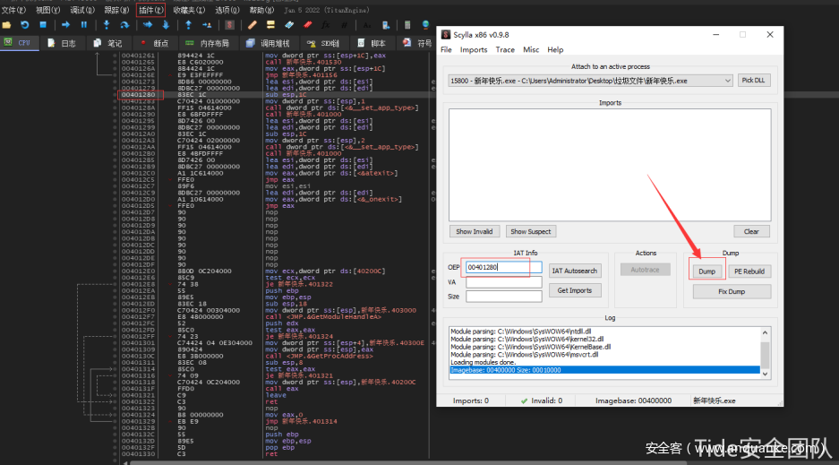雙擊jmp跳轉(zhuǎn)到401280,使用插件sclla,修改OEP為401280,點擊dump,dump到本地文件。保存即可。