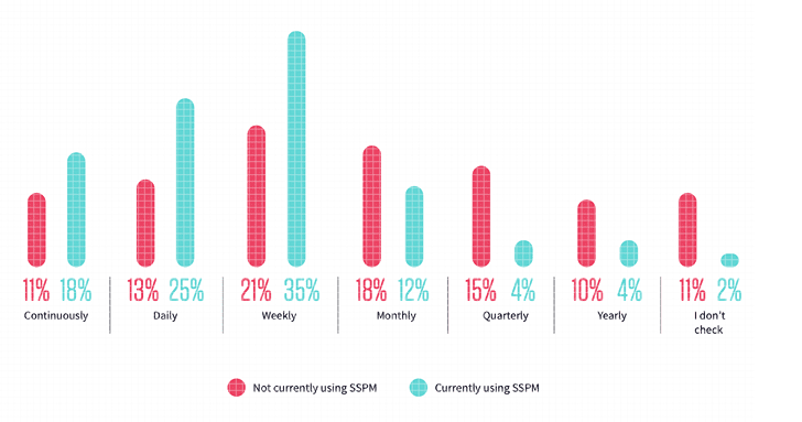 另外,已經(jīng)實施 SSPM 的組織可以更快、更準(zhǔn)確地檢測和修復(fù)他們的 SaaS 錯誤配置。這些組織中的大多數(shù) (78%) 使用 SSPM 每周或更多次檢查其 SaaS 安全配置。在解決錯誤配置方面,81% 的使用 SSPM 的組織能夠在一天到一周內(nèi)解決它。