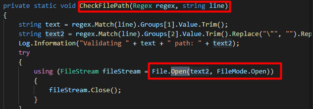 AWSVPNClient.Core.dll 包含 OvpnConfigParser.cs,它主要用“CheckFilePath”方法來檢查文件路徑是否有效。如上圖代碼中可發(fā)現(xiàn):函數(shù)中調用了File.Open()。