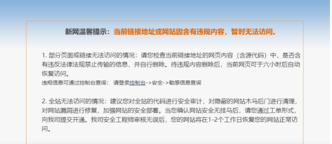 某上?蛻舻募揖呔W(wǎng)站最近被新網(wǎng)攔截了,直接輸入網(wǎng)站域名訪問(wèn)提示:當(dāng)前鏈接地址或網(wǎng)站因含有違規(guī)內(nèi)容,暫時(shí)無(wú)法訪問(wèn)。目前客戶做了百度競(jìng)價(jià)推廣,一天消費(fèi)在500左右,由于網(wǎng)站打不開(kāi),損失慘重,通過(guò)朋友介紹找到我們SINE安全,根據(jù)客戶目前的情況我們隨即成立網(wǎng)站安全應(yīng)急響應(yīng)組,針對(duì)網(wǎng)站被新網(wǎng)攔截的問(wèn)題,進(jìn)行緊急處理,下面記錄分享一下我們的處理過(guò)程和解決辦法。首先我們來(lái)看下網(wǎng)站被新網(wǎng)攔截的截圖: