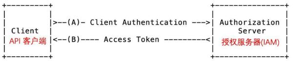 上圖為OAuth2.0規(guī)范標(biāo)準(zhǔn)流程圖,結(jié)合此場(chǎng)景中,對(duì)應(yīng)OAuth2.0中的角色,API客戶端作為OAuth2.0的客戶端、IAM則為授權(quán)服務(wù)器。