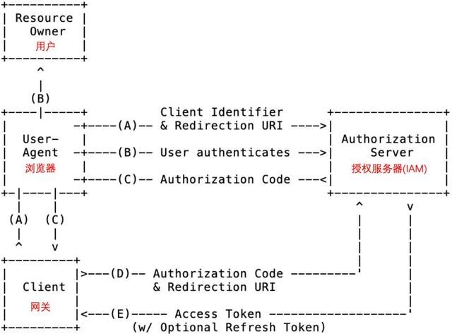 上圖為OAuth2.0規(guī)范標(biāo)準(zhǔn)流程圖,結(jié)合此場(chǎng)景對(duì)應(yīng)OAuth2.0中的角色,用戶是資源所有者、瀏覽器為用戶代理、網(wǎng)關(guān)作為被授權(quán)的客戶端、IAM則為授權(quán)服務(wù)器。