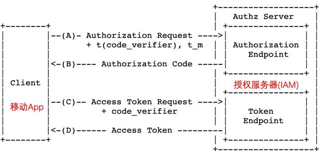 • (C) 移動(dòng)App客戶端收到授權(quán)碼后,將授權(quán)碼和code_verifier秘鑰串發(fā)送到授權(quán)服務(wù)器,用以申請(qǐng)?jiān)L問令牌。