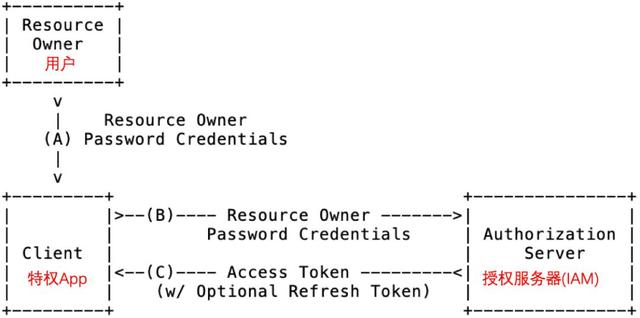 • (B)特權(quán)App將用戶憑據(jù)提交給授權(quán)服務(wù)器IAM,申請(qǐng)?jiān)L問令牌