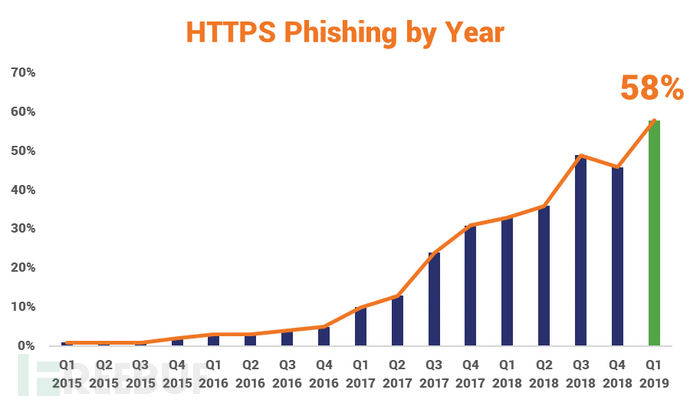 根據(jù)FireEye的報告,在2019年前三個月基于HTTPS URL的網(wǎng)絡釣魚攻擊的增長率為26%。