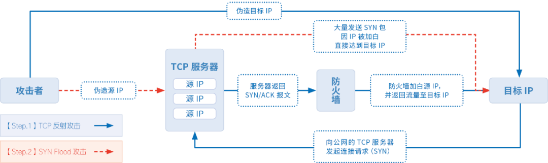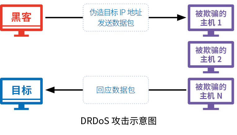 DDoS攻擊形態(tài)由起初一對一的DoS攻擊,向借助C/S系統(tǒng)技術(shù)的DDoS攻擊模式演進;近年來已形成不需要配備大量肉雞、利用廣播地址與回應(yīng)請求實現(xiàn)拒絕服務(wù)的DRDoS攻擊模式。