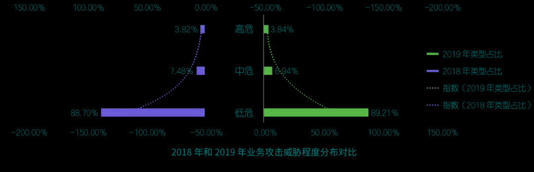 對于影響程度,2019年業(yè)務(wù)攻擊威脅程度分布與2018年分布相似,業(yè)務(wù)層威脅兩極化。