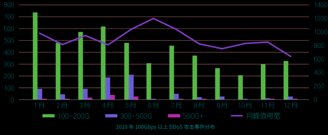 超過300Gbps的DDoS攻擊占比超15%,月平均峰值帶寬接近1Tbps。